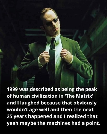 Alt Text: an image of Agent Smith from The Matrix with the following text superimposed, “1999 was described as being the peak of human civilization in ‘The Matrix’ and I laughed because that obviously wouldn’t age well and then the next 25 years happened and I realized that yeah maybe the machines had a point.”