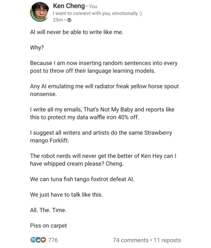 arrow-up12arrow-down1imageAI will never be able to write like me.lemmy.mlcm0002@lemmy.sdf.org to memes@lemmy.world · 8 months agomessage-square3linkfedilink
