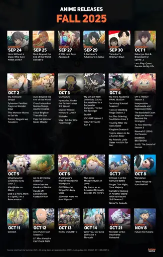 KoalaUnknown@lemmy.world to Anime@ani.socialEnglish · 7 days agoFall 2025 release schedulelemmy.worldimagemessage-square3linkfedilinkarrow-up146arrow-down10