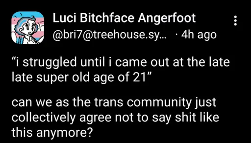 minus-squarebelated_frog_pants@beehaw.orglinkfedilinkEnglisharrow-up1·23 days agoGod, you can come out at any age, your 20s isnt too old. Your 30s isnt too old. Your 70s isnt too old. Stop this shit.