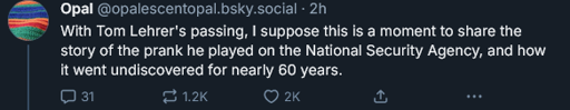 General_Effort@lemmy.world to memes@lemmy.worldEnglish · 3 months agoTIL Tom Lehrer worked for the NSAplus-squarelemmy.worldimagemessage-square1linkfedilinkarrow-up11arrow-down10